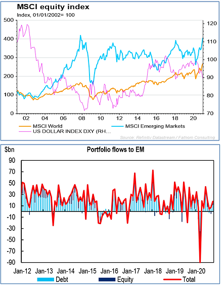 Chart 5 and 6: A weak dollar and low US real rates should drive flows to Emerging Markets (Source: Chart 6: CitiResearch)