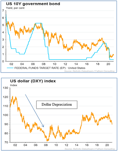 - Lower US interest rates relative to other countries can drive money away from US into other geographies.