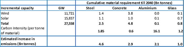 Based on our calculations, meeting the IEA's estimates will require the current installed wind and solar capacity to substantially increase from ~1,440 gigawatt (GW) today to 16,000 GW by 2040. Due to the low-capacity factor of renewables, the doubling of installed power generation capacity will lead to a generation increase of only 35%. Assuming a 5% replacement rate, the cumulative capacity additions to wind and solar till 2040 stand at 11,700 GW and 15,800 GW, respectively. The buildout of these “clean” energy solutions under the “Sustainable Development” scenario is likely to increase CO2 emissions by at least 10 bn tons. This calculation excludes emissions attributed to developing storage infrastructure, transmission lines, mining of rare earths and transportation related activities.