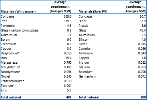 Each new MW of solar power requires ~130 tons of steel and concrete; each new MW of wind power requires ~450 tons of steel and concrete. Additionally, wind also requires ~ 130 tons of rare earth elements per GW. ⁽⁶⁾