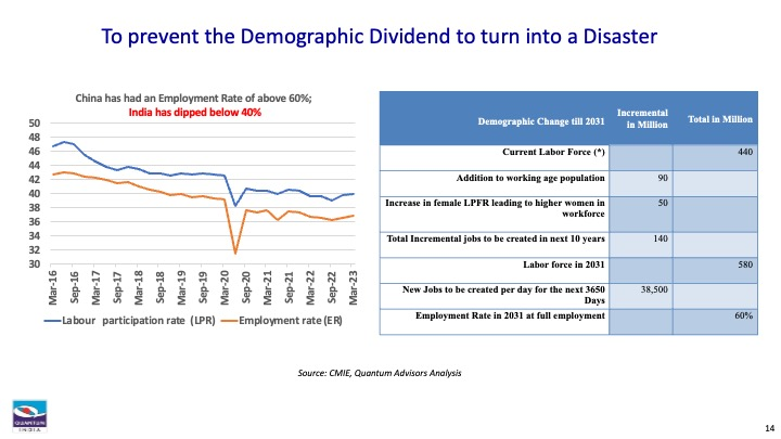 India needs to create ~>27,000 jobs per day for the next 10 years to absorb its growing young workforce. It will need to add more, to absorb movements away from agriculture. India's dismal female labor force participation will also rise as salaries rise enough to motivate women to seek work outside the homes leading to more job demands.