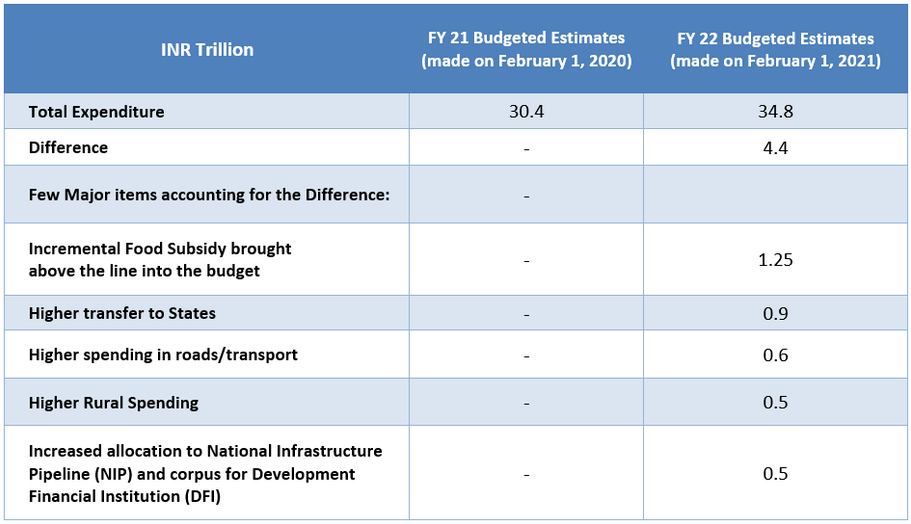 The revised FY 21 estimates also pegs the total expenditure at INR 34.5 trillion. However, a larger increase in spending is re-apportionment. It is existing food subsidy spending now correctly reflecting in the budget numbers. This increase in food subsidy helped buffer India’s lockdown and COVID shock. However, it was already accounted for.