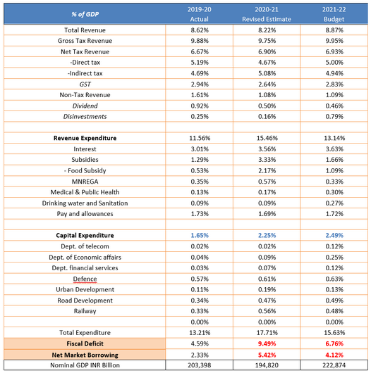 - FY 22 Fiscal Deficit pegged at 6.8% of GDP as against market expectations of 5.0%-5.5% of GDP.