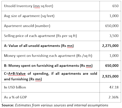 The Indian economy would get a boost in consumption of 2.4% of GDP. Furthermore, this clearing would act as a catalyst for subsequent investment in real estate. If there are an estimated 650,000 homes in residential projects across India which can find buyers, there is a need for furnishings, consumer white goods - and cars and 2-wheelers to fill up the parking spaces! With inventory clearing everywhere, companies will be ready to start their natural capex cycles – even those in real estate development. Of course, for this momentum to occur, real estate developers need to slash their asking prices by maybe 20% to 25%. The super-normal profits of real estate developers may be wiped out. Some real estate projects may not even make money!