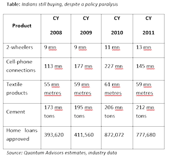 The headlines in CY 2011 captured the policy paralysis in New Delhi. The UPA-led coalition government (headed by a stiff Prime Minister whose silence has damned him into public disrespect) froze the big-ticket capital expenditures by private enterprise to Absolute Zero. But, below the headlines, the million mutinies of small-ticket consumption kept the India story humming to ensure a > 7% rate of growth. And India's government controlled Public Sector Undertakings (PSU's) continued their capex.