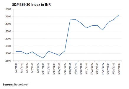 In May 2009, the incumbent Congress-led coalition did better than expected and stocks surged by +17.2% in 36 seconds of trading on May 18