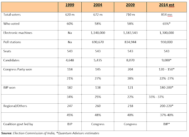 For the elections in May 2009, the market was expecting the incumbent Congress-led coalition to win fewer seats. They fared better. The stock market went ballistic and gained +17.2% in 36 seconds of trading, punctuated by 3 circuit-breakers. But that buoyancy did not continue. So far, this government has delivered a stock market return of +44% in INR (+10% in USD). An investment in fixed deposits over the past 5 years may have been better!