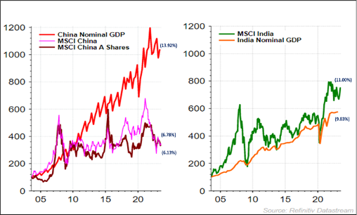 Source: Refinitiv DataStream, All data in USD, GDP data is quarterly till Dec 2022, Index data is monthly till July 2023, GDP data is Quarterly, MSCI Indices is monthly, Data in numbers are %CAGR
