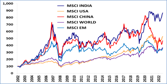 Source: Data in US Dollars, Rebased on Dec 2002; Data till Julu 2023; MSCI Equity Indices