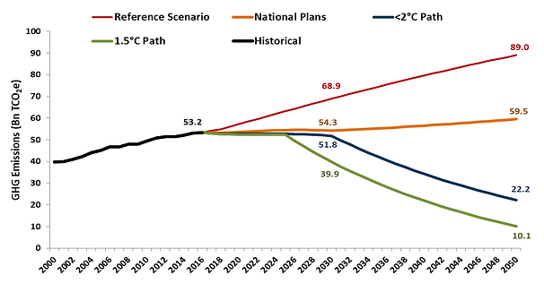 The Paris Agreement in 2015 saw 195 countries commit to limit global warming to well below 2 °C (1). The Agreement’s long-term goal is to limit global average temperature rise to below 2 ° C (above pre-industrial levels) and to pursue efforts to limit the increase to 1.5 ° C. Based on the analysis of each country’s NDCs (National Plans), global GHG (Green House Gases) emissions are expected to remain within the 55 billion tonnes to 60 billion tonnes range from 2030 to 2050. However, the more ambitious outcomes that require global warming to be within the 1.5 ° C to 2 ° C range require steeper declines in emissions from current levels of ~ 55 gigatons to a maximum of 22 gigations by 2050. Achieving the above targets will require significant reductions in absolute and per capita GHG emissions from the current levels.