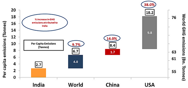 For a country like India, which is still in the developing stage, the challenge is twofold. In addition to providing its large population with access to affordable energy, the focus is also on transitioning to “cleaner” sources of energy. Assuming other countries can achieve their NDC’s by the year 2030, the chart below estimates India’s contribution to total GHG emissions at per capita levels equal to that of the World (6.7 tCO2e), China (8.4 tCO2e) and USA (18.2 tCO2e).