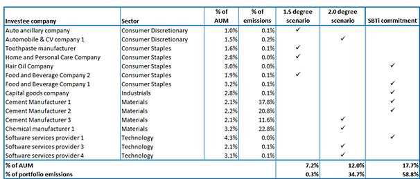 Majority of the emissions are currently contributed by the materials sector. We are reasonably confident that the emission intensity will decline in the medium and long-term. Most of our investee companies and particularly those that belong to the “hard to abate” sectors have aligned themselves to the SBTi and have set internal carbon prices.