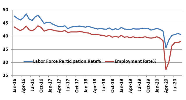 The employment situation has gotten worse. As Chart VII shows, Indian economy and its informal workforce suffered a major blow post the shocks of demonetization, GST and the continued credit crisis. India's Labour Force Participation rate and the employment rate have fallen consistently over the last 5 years. Employment Rate was below 40% before COVID well below other Asian economies.
