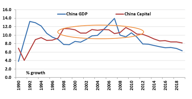 Source: Total Economy Database, July 2020 release, GDP growth (natural log), growth in total capital