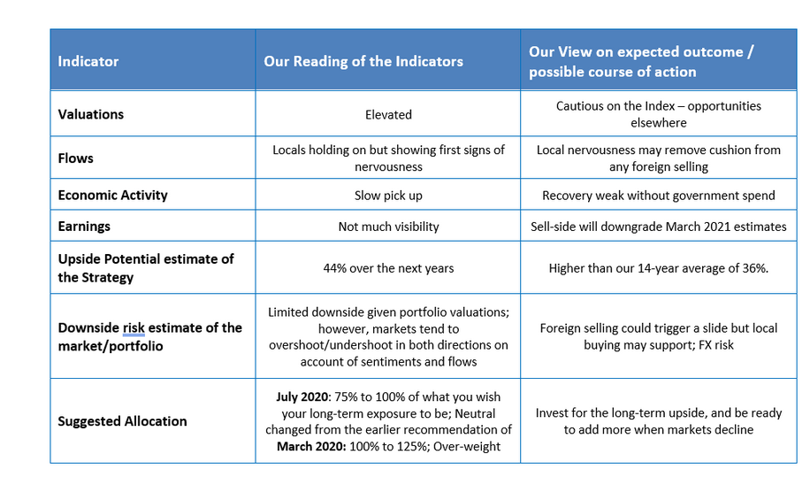 - In the very near term, with uncertain zero earnings visibility, equities are likely to be driven by A) success or failure of outcomes of policies dictated by a government that is still not coming to grips with the economy's real problems, and B) fears of disruption caused by the virus. If the market is disappointed, we believe a 20% correction in USD terms is possible as the PE for the SENSEX has almost gone back to its highs.