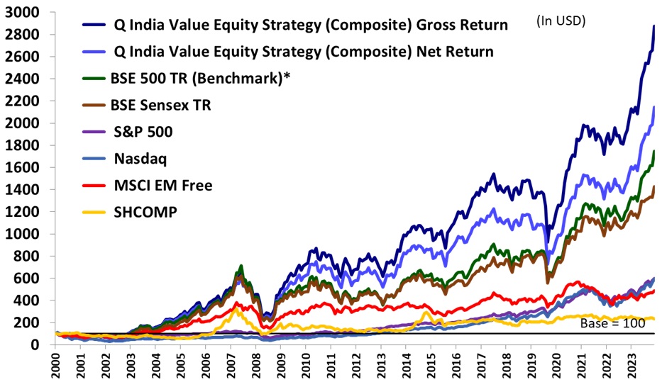 Quantum India Value Equity Strategy through this team-driven, disciplined, bottom-up, proprietary stock selection process has thus generated 13.0% CAGR in US Dollars (as of the end of March 2025), net of fees since August 2000. (The BSE-500 TRI Index (benchmark) returned 11.9% during the same period)