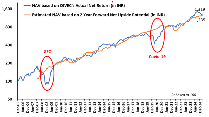 In the dynamic world of finance, where uncertainty often holds sway, Q India Value Equity Strategy carves a niche for itself, presenting certainty born out of a robust research and investment process. While equity investment outcomes can be unpredictable, Quantum's commitment to a disciplined approach emerges as a beacon of stability in the financial landscape. One compelling piece of evidence attesting to Quantum's prowess is the Unique Estimated Upside Potential chart, a visual testament to the alignment of past estimation with present. This chart, diligently estimated every month since December 2005, stands as a testament to Quantum's commitment to transparency and accuracy. Providing estimates of the Portfolio's NAV two years forward, the chart is a unique tool that unveils the potential to deliver in line with the upside in an investment.